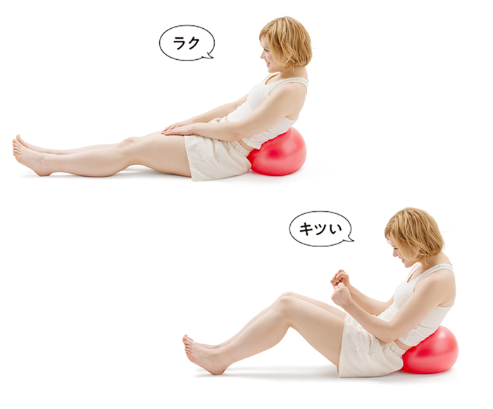 腰にボールを置いて寄りかかるだけ。足を伸ばすとラクに、ひざを立てるとキツくなります。体の倒す角度でも負荷が変わってきます。