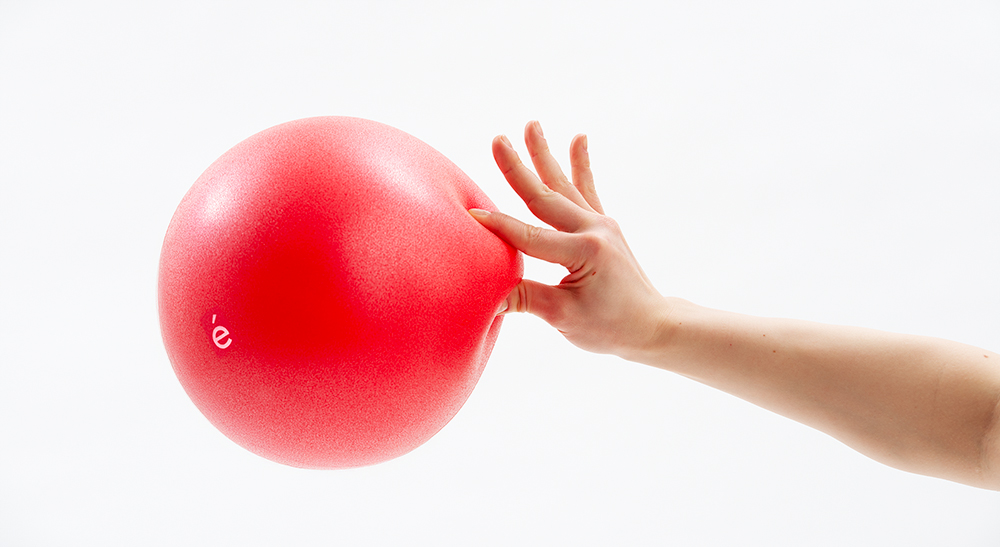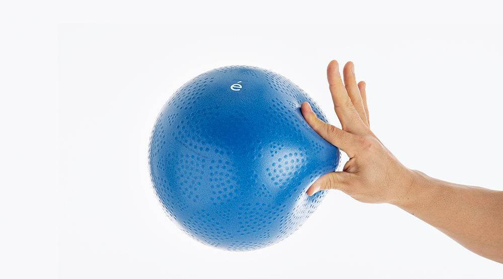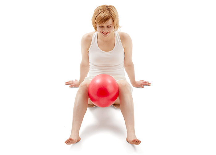 ボールをひざの間にはさんでゆっくりつぶし、ゆっくり戻します。