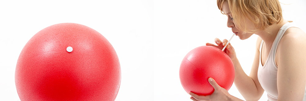 ボールの穴に付属のストローを差し、口で空気を吹き込んでください。お好みの大きさにふくらんだら、付属の栓をしっかりと差し込んでください。時間の経過とともに空気は少しずつ抜けていき ますので、ストローで空気の調整をしてください。